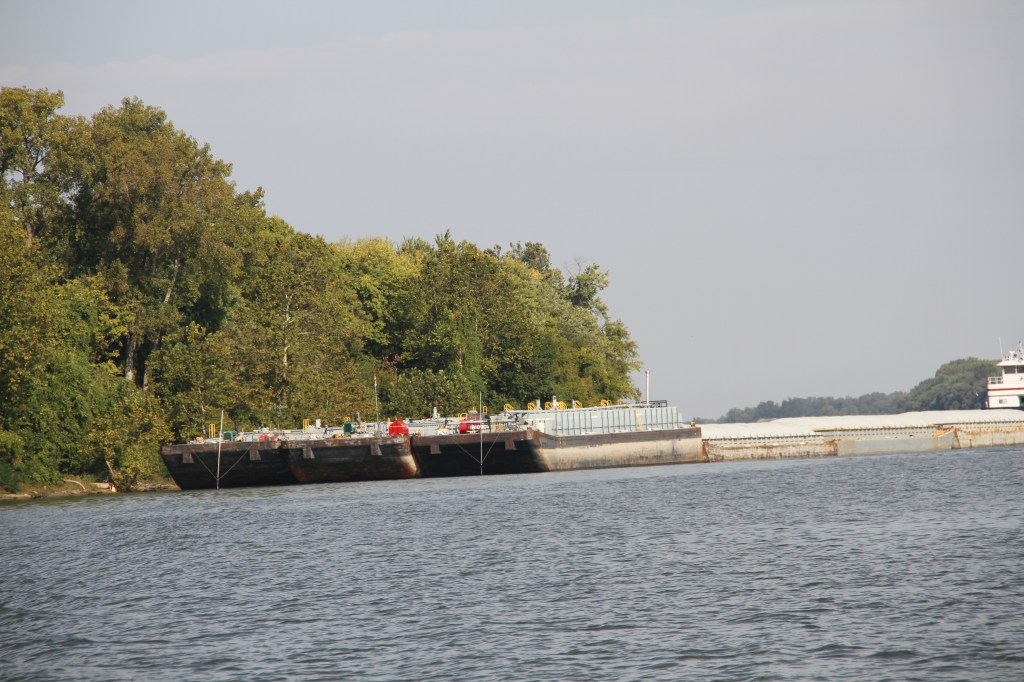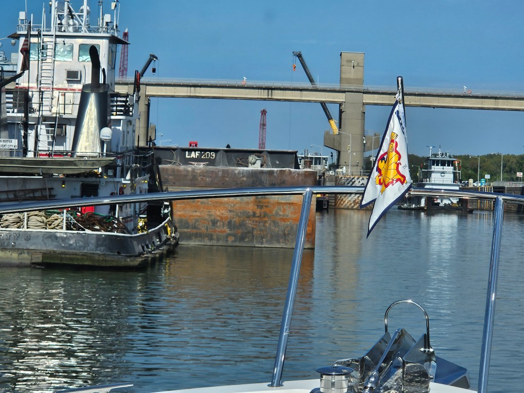 In anticipation of the slowdown at the lock, we rose at 5AM to arrive early to the lock. (We had already lost an hour’s sleep when we recently switched to Central Standard Time.) We called the lockmaster an hour out from the lock to request a lock-through. He responded that it would be 12 hours before he could load us into the lock. “Not until Tonight?” Mike replied surprised. We were not keen on traveling the river after dark. “You’ll see why when you get here,” said the lockmaster.