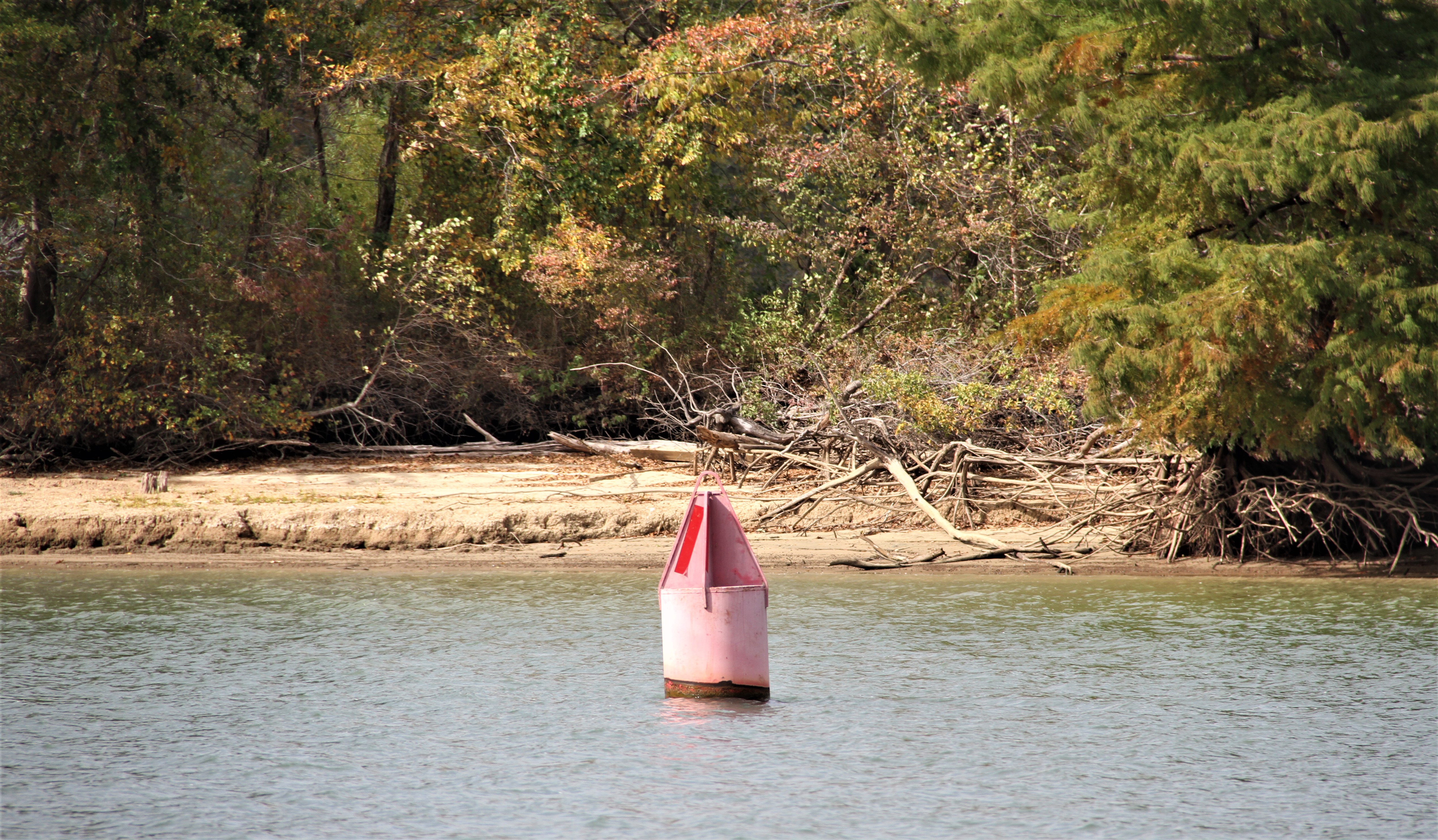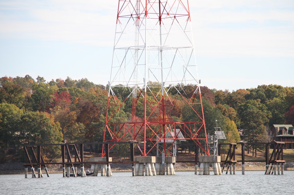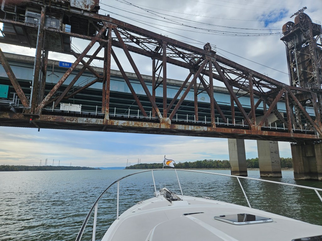 We stayed inside the commercial channel by keeping the red buoys to port. But the buoy pictured above, had been moved from its original location by flood currents or a knock by a barge. It was so near to shore that it was obvious we should keep it to starboard. It’s not always obvious when buoys are out of place but usually, after a discussion, we agree which side to take them on. So far we have been right. The TVA and U.S Coast Guard do a stellar job looking after navigational needs on the Tennessee River.