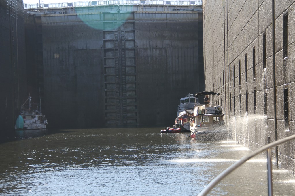 Most often, boaters communicate with lockmasters by VHF radio but rarely see the person behind the mic. Communication is direct and to the point. But sometimes we meet a personable lockmaster, like the man at Whitten Lock who apologized over the VHF to the boat who had the water spraying into his cockpit. Then the lockmaster set our minds at ease by confirming that we would all get to Fulton before dark. “Take it easy,” he encouraged. While the lock was in its first stages of filling, he came out of his control both, walked the length of the lock, and waved. Using the VHF, one of the boaters announced, “Well, you’re Mr. Congeniality! We haven’t seen a lockmaster since we left Chicago!” The lockmaster replied” Well, I’m glad you got to see my purdy face.”