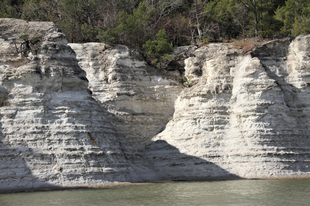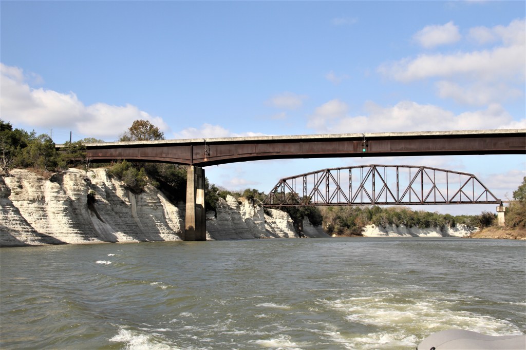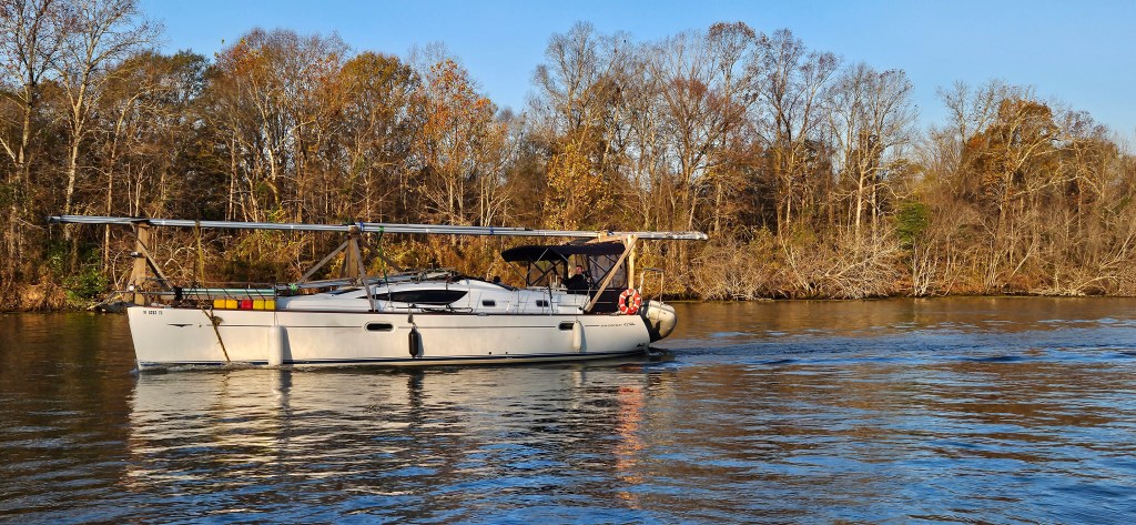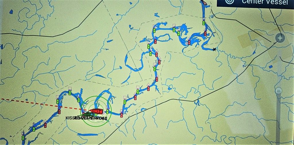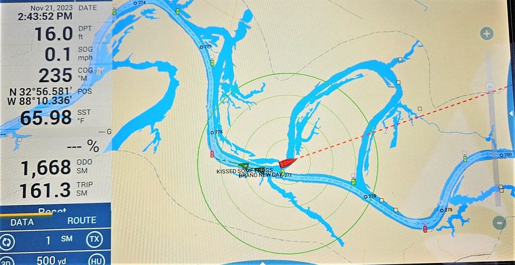 The following morning we left the marina at 5:30. It was dark. Very dark. We used a high-powered spotlight to highlight the perimeters of the marina’s narrow channel. We retraced our path from when we had arrived the day before as best we remembered it. We kept the marina’s white buoy to port and stayed slightly starboard of centre of the channel. Those had been the marina’s instructions for entering. River water was at a winter-low, the channel was shallow. The depth sounder read half a foot, but our transducer is set for 4 feet of clearance under our keel. That meant we had 4.5 feet. Our draft is 3.9 feet.