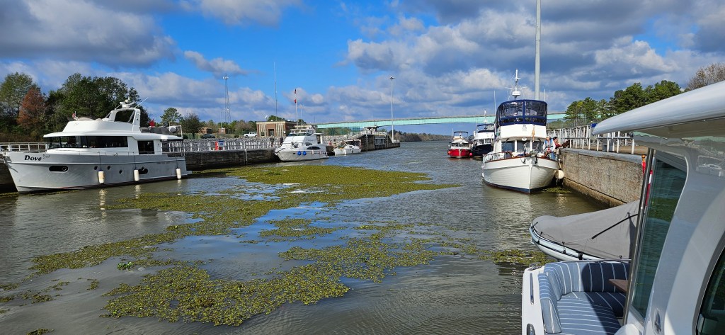 Suddenly, I hear the words,”Oh Canada.” I look up; it’s the lockmaster standing over me. He informs me how we are to leave the lock when the gates open. Usually, this is a no brainer; boats leave in the order in which they came in, the forward, middle and back boats peel off in that order. But he wanted all boats on the starboard side to leave first, followed by the boats on the portside starting with the Ranger Tug. “And”, he adds, “DO NOT pass anyone until you get out of the lock!” Boy, he woke up on the wrong side of the bed this morning.
