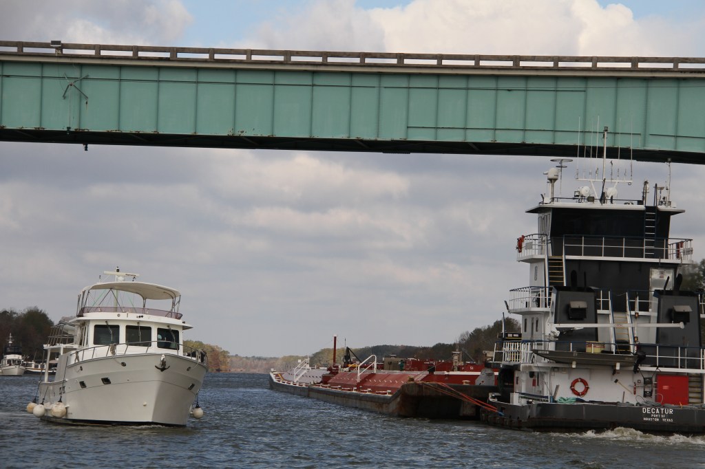 Almost immediately, the lockmaster left his control booth and walked with purpose around the lock to the Ranger Tug. He called down to the tug with a reminder that he had earlier announced that no one was to use that pin. “But you’re there”, he said, “Move back as much as you can when the gates open.” ( That must have had the owners perspiring all the while the lock was emptying.) Just before the lockmaster left, he added: “When you get to your destination, I want you to take a Coastguard course on how to handle a boat.” ( Ouch, I thought. I don’t think the comment was called for. The 32-foot Ranger Tug weighs about 12, 500 IBs, (that’s light), and the bow thruster sounded like my hair dryer. (No offense meant.)