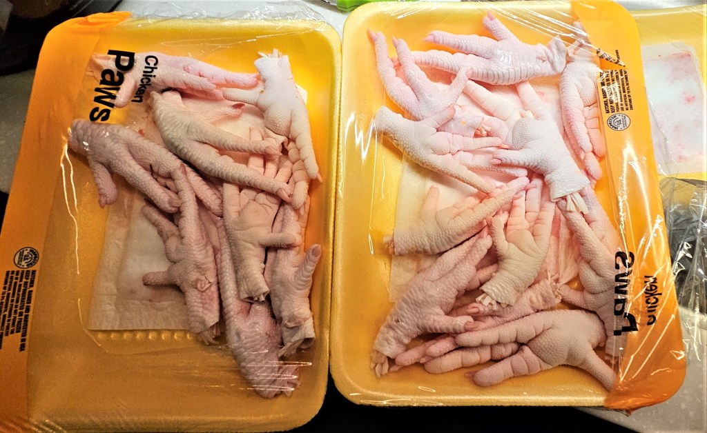 It was American Thanksgiving and in celebration, we planned to cook a boneless turkey breast  for dinner that night. I could use some of the leftovers in turkey soup. But how would I make soup broth without turkey bones? While shopping at Walmart the night before, I spotted packaged chicken feet at the meat counter.  I grew up on beef tongue and chicken giblets but feet? My mother never introduced us to those.