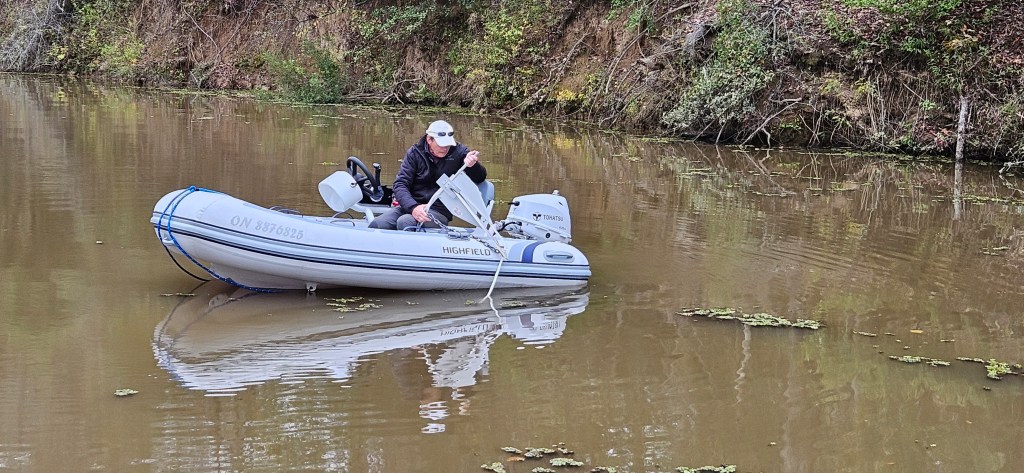Creeping gingerly up the creek we watched for low depth soundings, anchored stumps and floating logs among brackish water.
