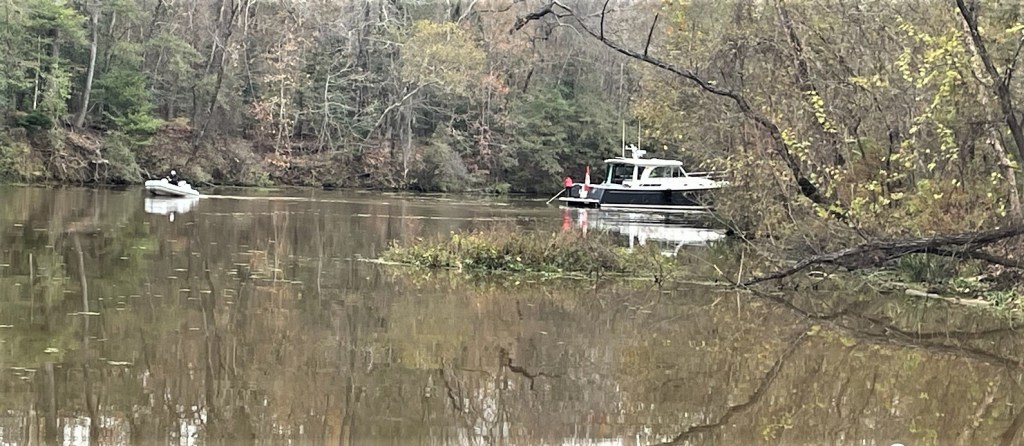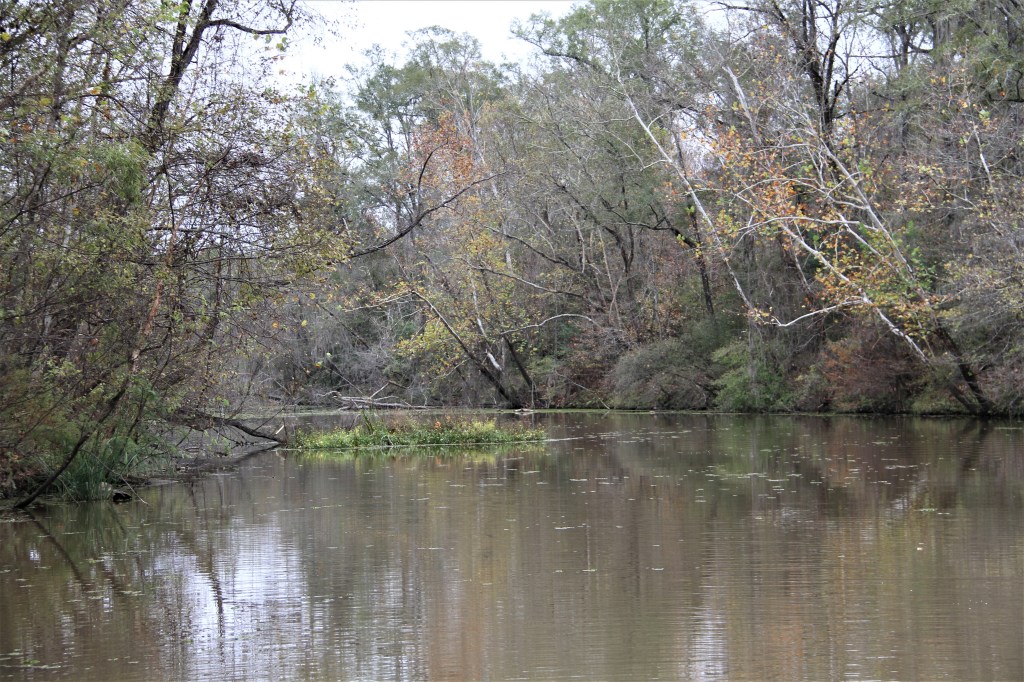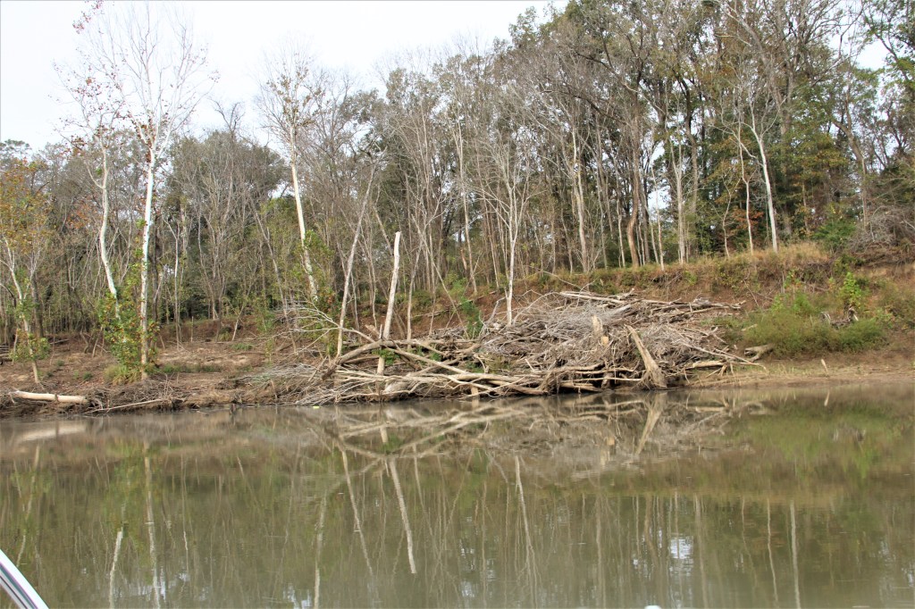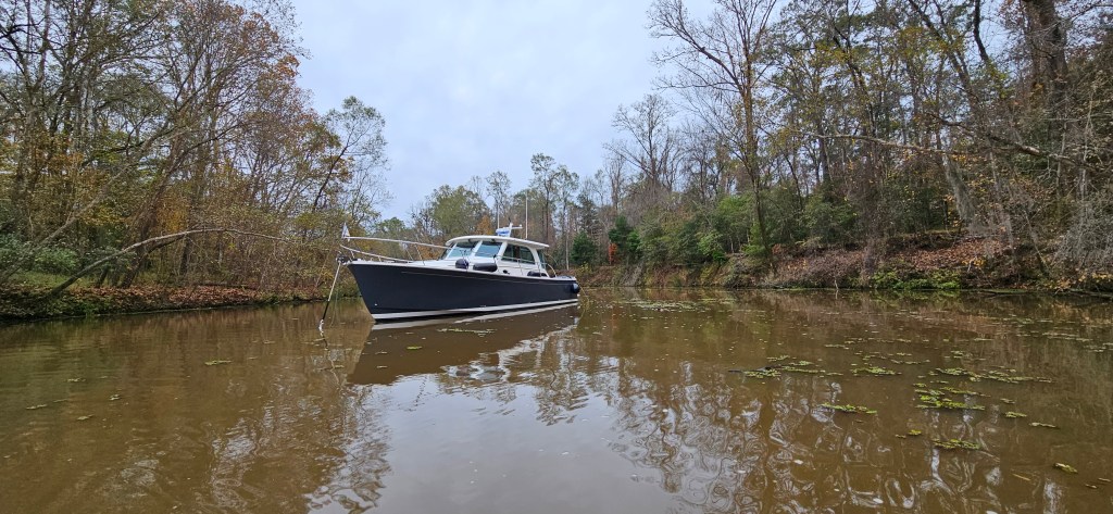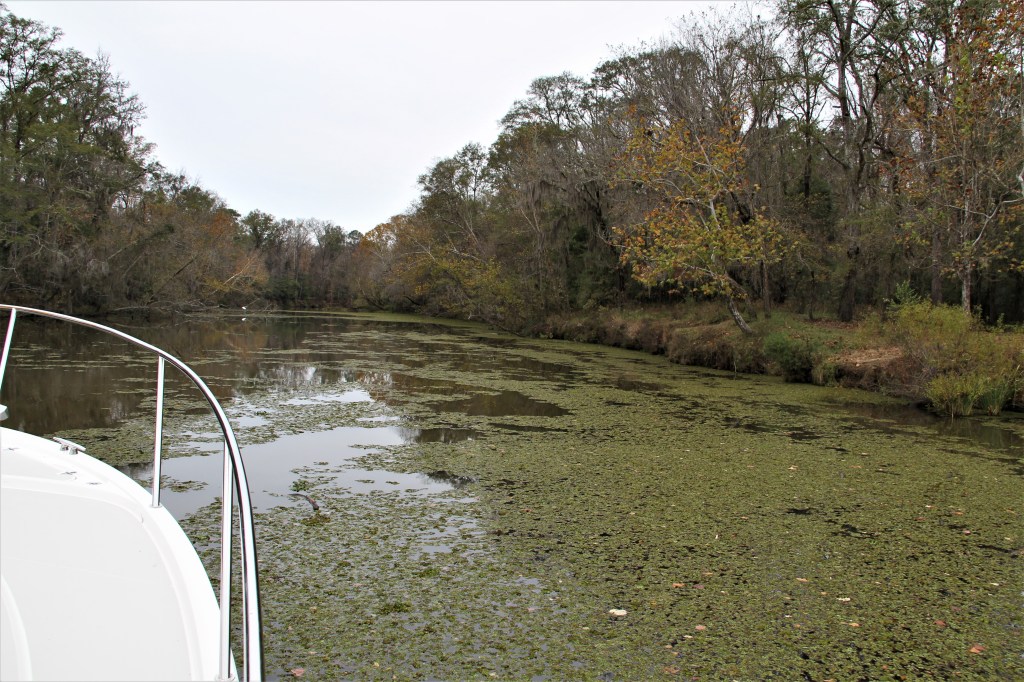 The creek runs through the Choctaw National Wildlife Refuge and is too narrow for a single boat to swing on an anchor. We searched for where we could set a bow and stern anchor and not be under low hanging branches.