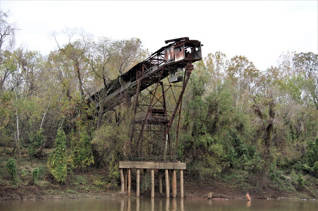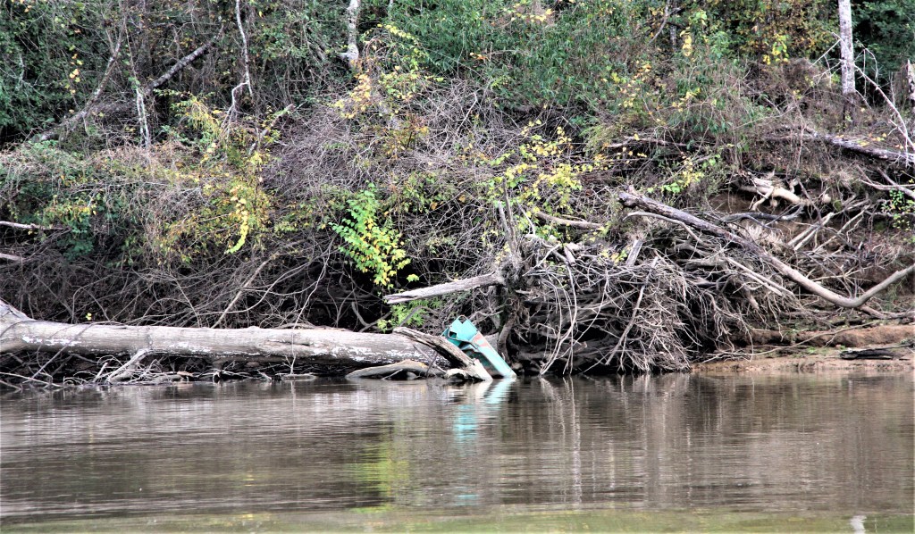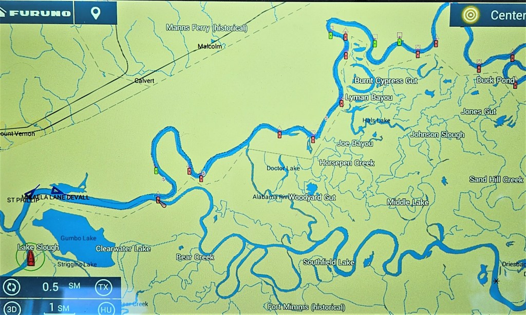 It is not an unusual occurrence to have the occasional marker missing on any river, the exception is the wide Tennessee River which is very well marked including her bridges. On this stretch of the Mobile River, several buoys were visible on the chart but missing on the river. Sometimes, we saw buoys swept to the shoreline.