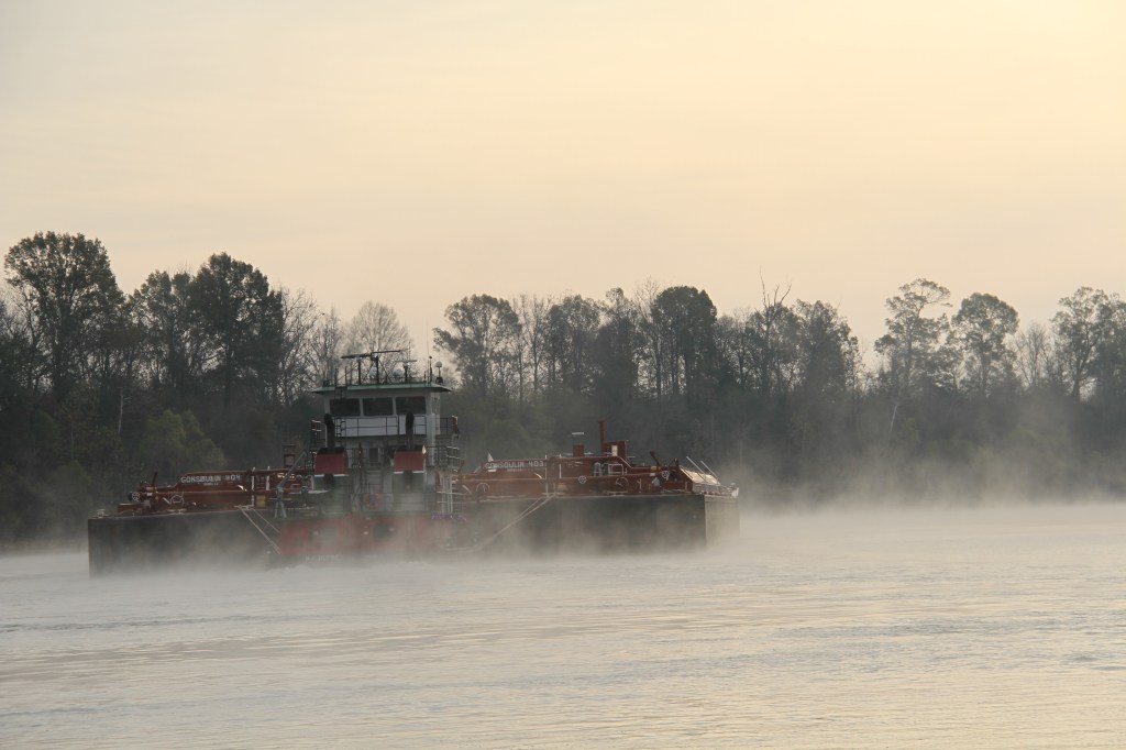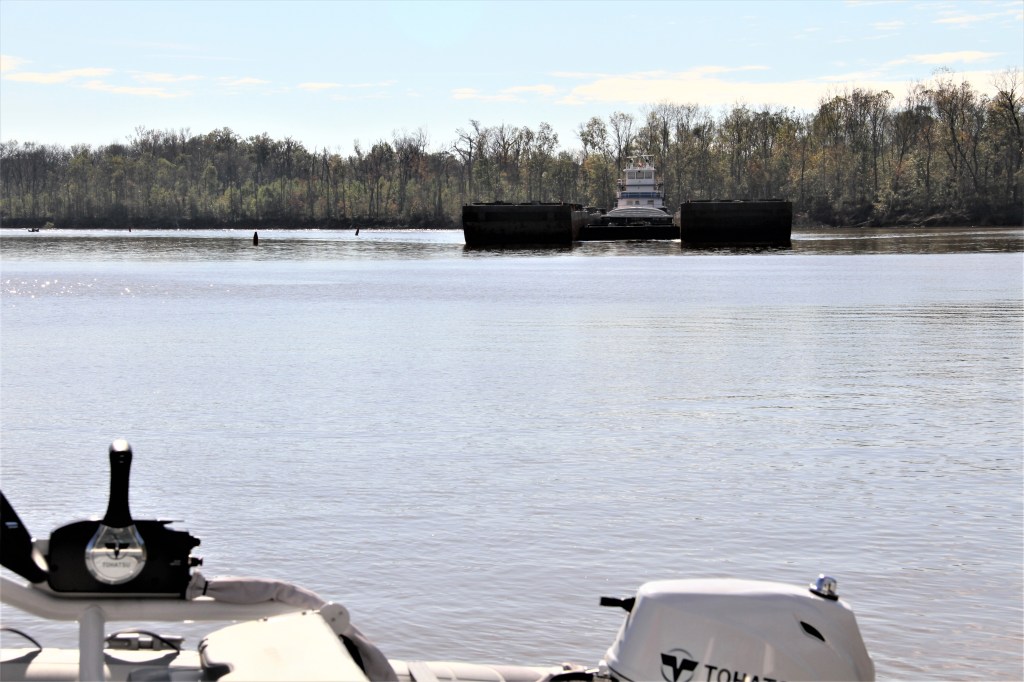 The narrow river repeatedly switches back on itself and we would often be headed north on our southerly route towards Mobile. In one instance when meeting a barge, we pulled off the river into a side-pocket while the barge navigated around a curve. (Top 2 pictures). I expect barges accidently hit the boys while navigating the curves.