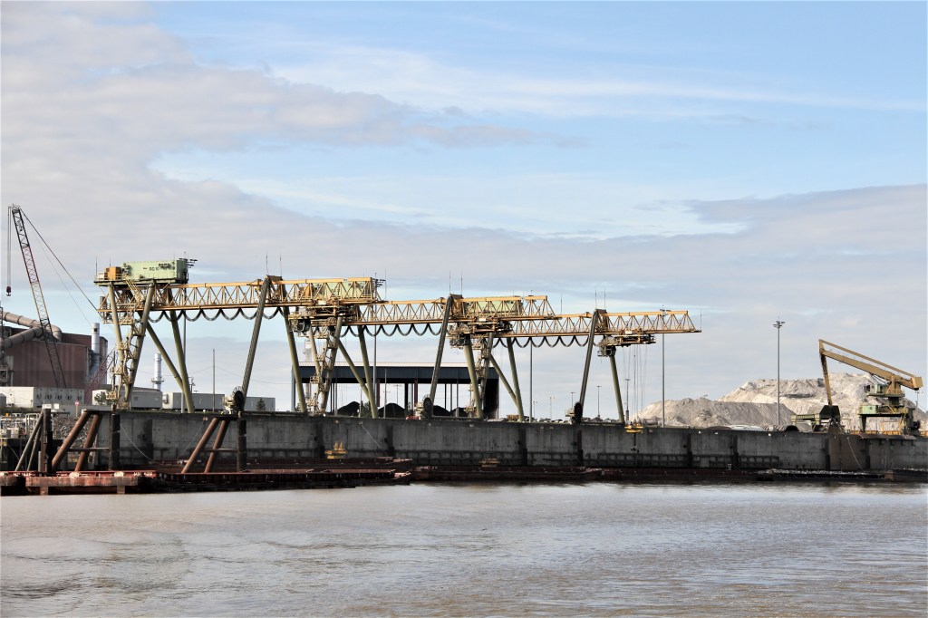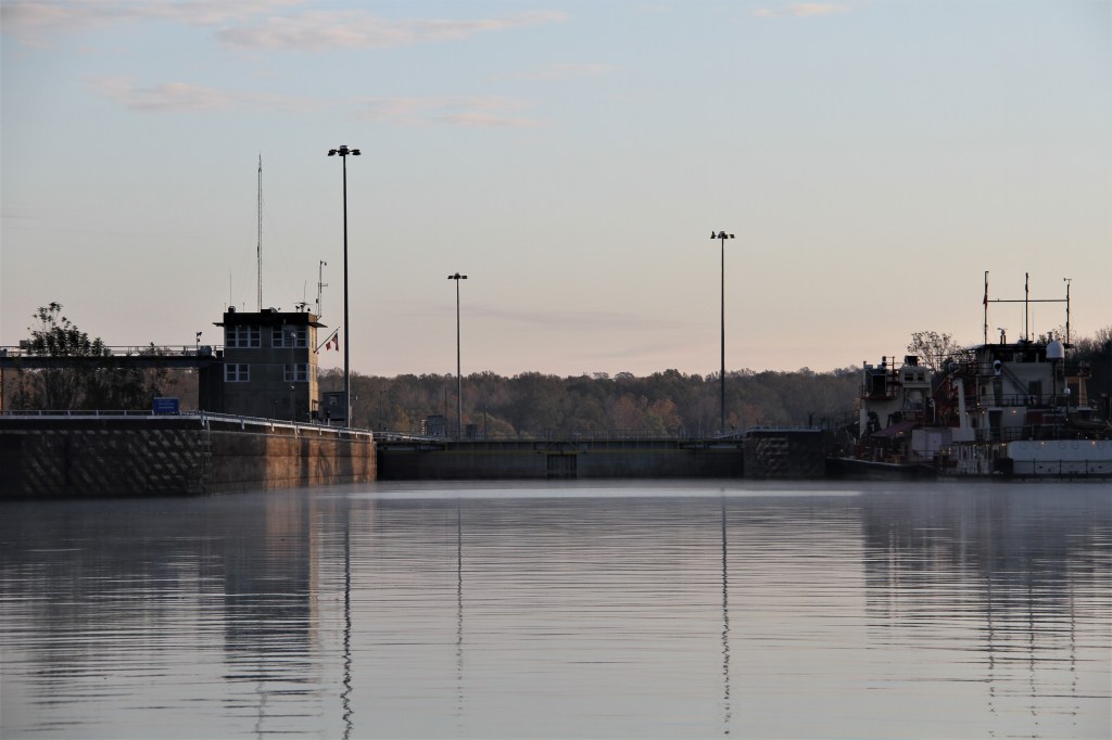 It was barely light when we lifted our anchors, confirmed that our fenders and lines were in place for the lock, and headed 5 miles downriver towards the lock. A boat that had anchored nearby, left shortly after us but there was no movement from a sailboat that had anchored nearer to the river. Arriving to the lock, we threw a line around a pin; the second boat did the same. Our timing to the lock was perfect. Then, the lockmaster received a call from the sailboat announcing they were on their way towards the lock. We waited for over an hour for them to arrive and tie up.