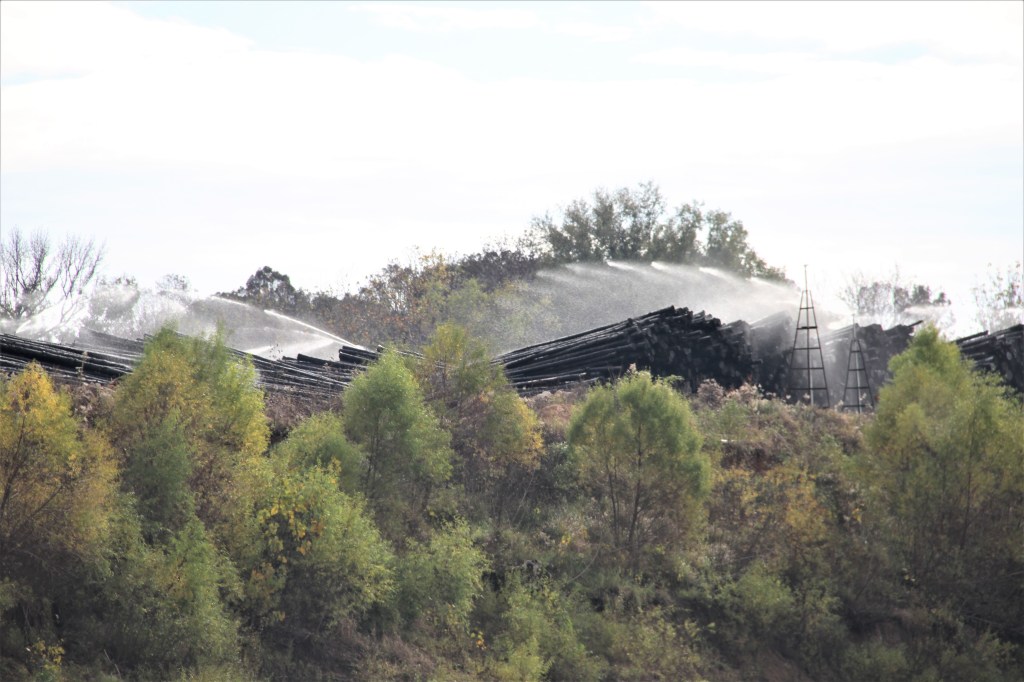 Softwood logs sprayed with water while decked in a storage yard are less likely to suffer mold stain and decay.