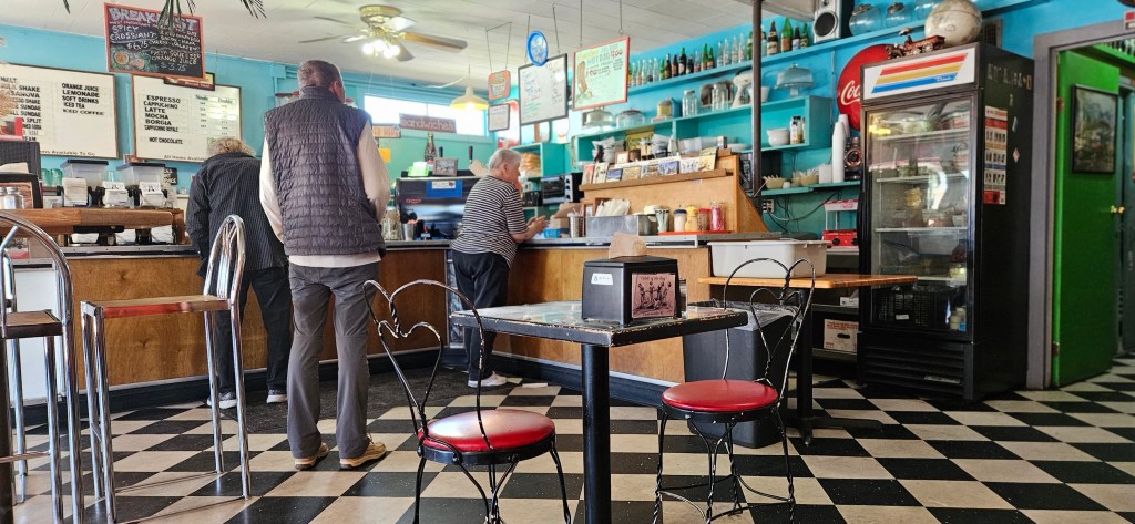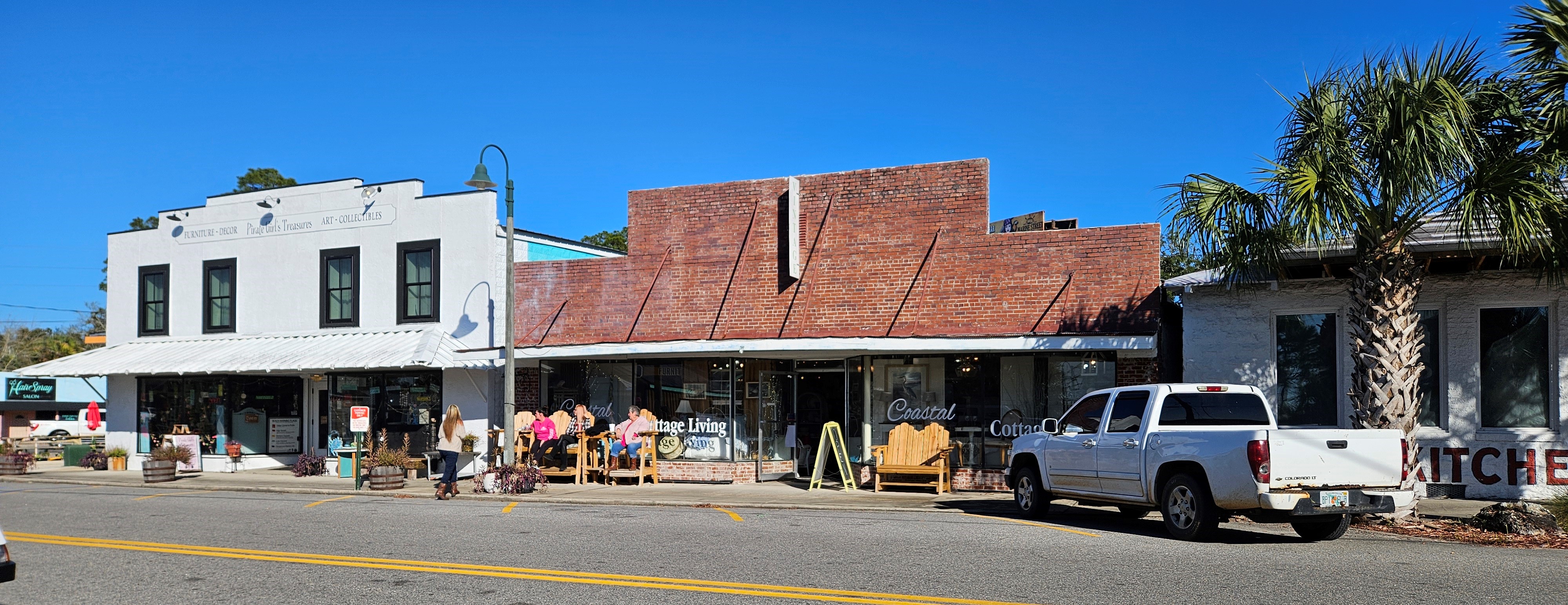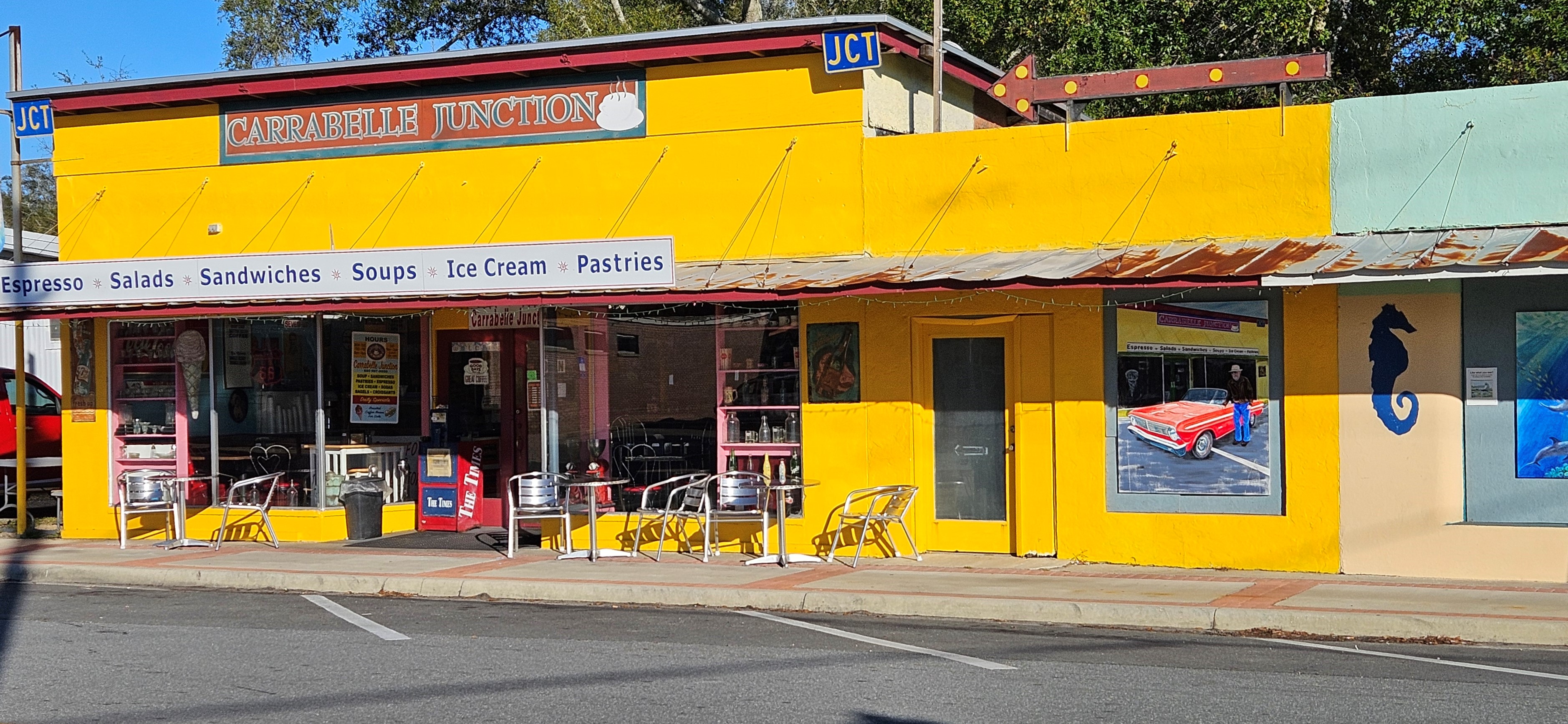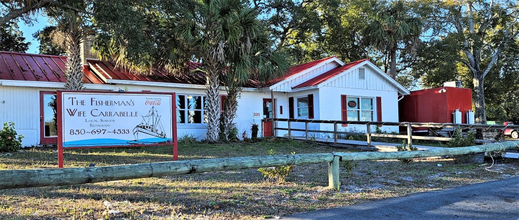 Pictured from the top: Carrabelle Junction – a diner-style lunch stop; inside the diner; shops on Main St., a lawyer’s office, rental cottages, The Fisherman’s Wife restaurant.