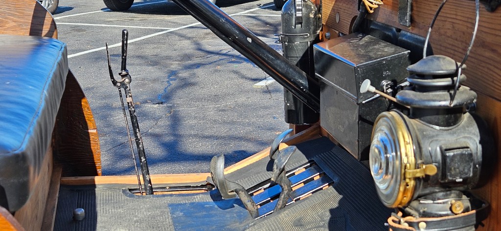 She gave me a quick lesson how to manage the vehicle. “On the steering wheel, the right lever is the throttle ( the car has no accelerator pedal), and the left one is the  spark advance. The left peddle is a 3-position gear shift: forward and down is low, towards the back is high and the middle position is reverse. The one on the outside and on the right, is a transmission break. The stick on the drivers side is a hand break.”