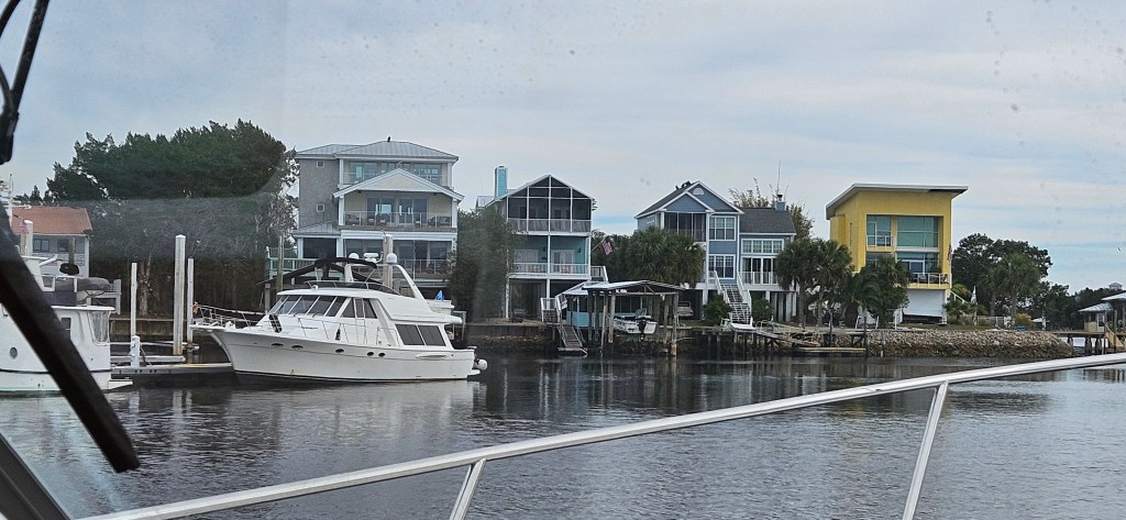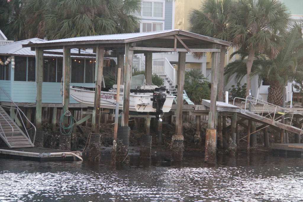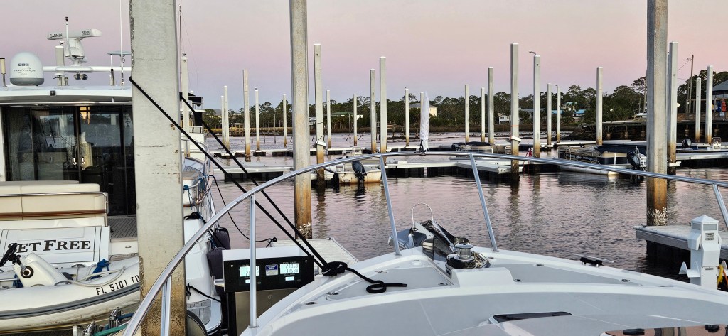 There are 3 marinas on the river, we had made reservations at one of them. We were aware this marina did not have a VHF radio; a very unusual occurrence for a marina. Using our cellphone, we called for directions to the marina and to learn the location of our slip. While waiting for a return call, we noticed, while passing the first marina, someone standing at the end of a dock, waving us in. “We’ve never have seen anyone do that before!” I exclaimed. There was no signage indicating the name of the marina but a sign that read ‘Welcome Loopers’ “I’ve never seen that before either. ” “What shall we do?” we asked each other. “Well, this must be our marina because why would they be waving us in?” In retrospect, that was pretty stupid because how would they know who we were? ( It must have been that bumpy ride across the Gulf that had shaken our senses loose.)