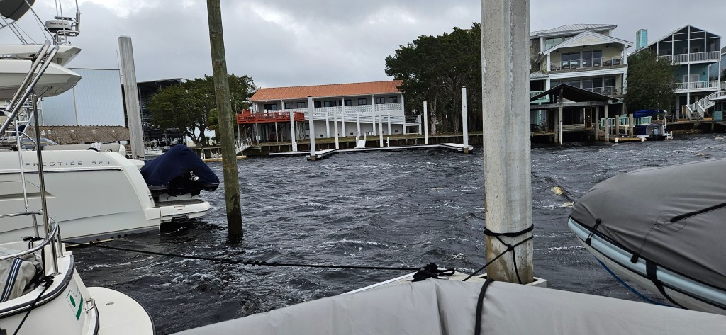 Everyone added dock lines, checked, and double checked for anything that could be torn loose in high winds and either removed them or strapped them down.