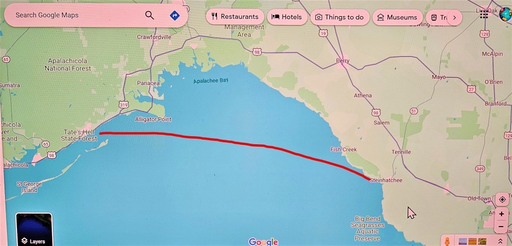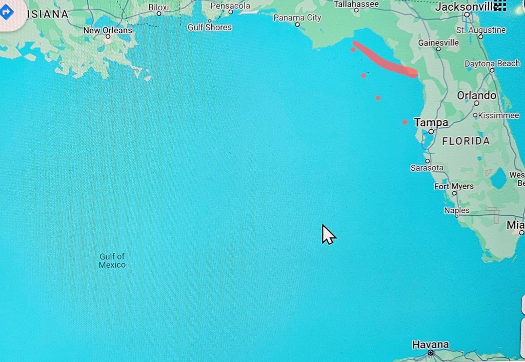 There is no marked channel crossing the Gulf. The weather service suggested we not do a dead reckoning to Steinhatchee but follow the curvature of the Gulf instead, resulting in a few more miles to Clearwater, but with quieter waves and softer winds.