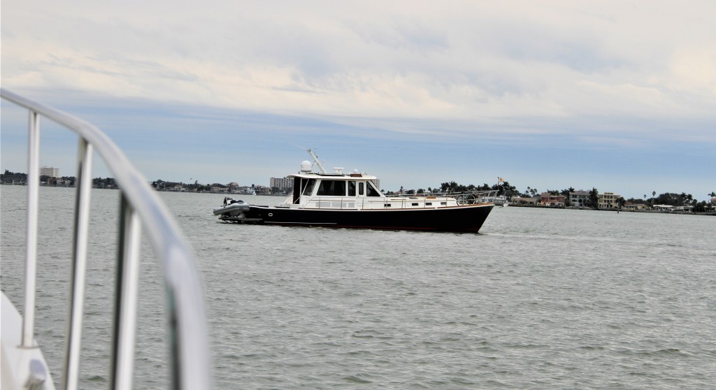 The railing you see on the left side of the picture is ours; the boat in the centre was just moments ago in front of us. Until he ran aground right where you see him, just metres away; an example of how narrow the channel can be in parts of the Intracoastal Waterway system. Wind, tides and water surges are constantly moving sand bars with the result that charts can be inaccurate. (In the picture, the two boats are not heading in the same direction due to the current in the Waterway. )