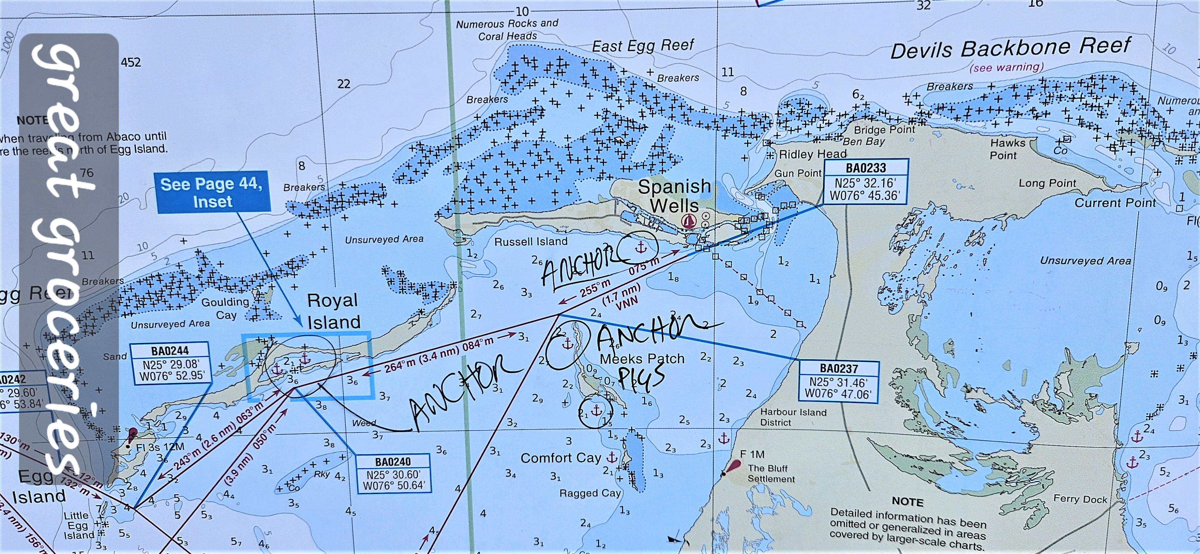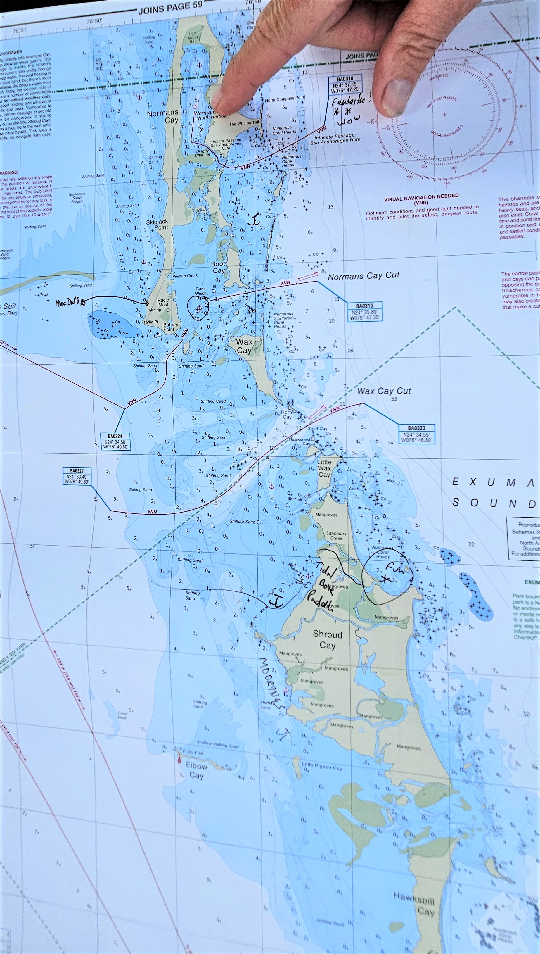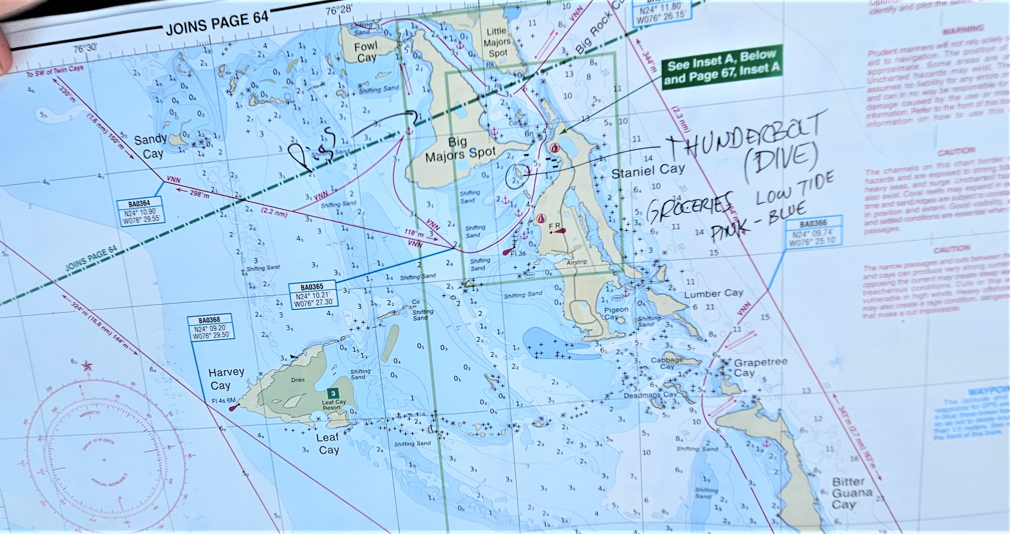 and they will often have you onboard their boats to look at their charts they have marked-up with their own handwriting. We came away with lists of ‘do not miss’ locations and pictures of their charts or someone else’s charts because often this information gets passed around. In addition, we had two chart books onboard: Waterway Guide: Bahamas 2024, and MAPTECH: The Bahamas to Crooked Island Passage.