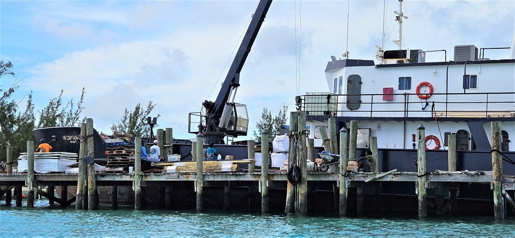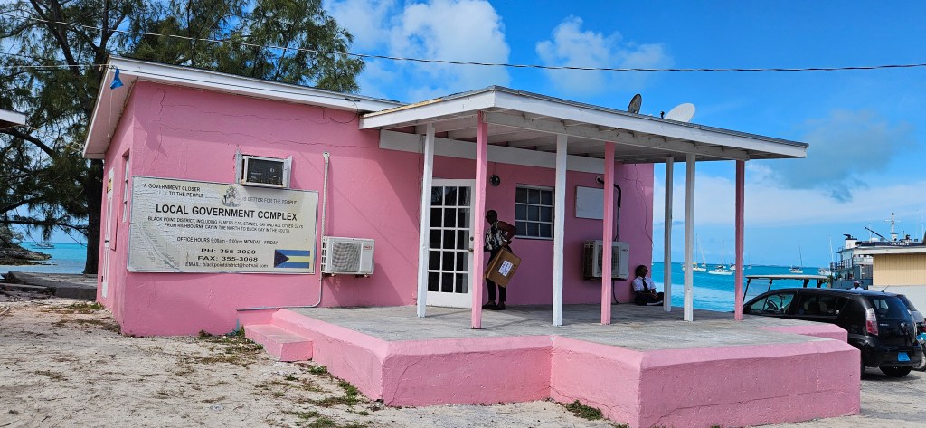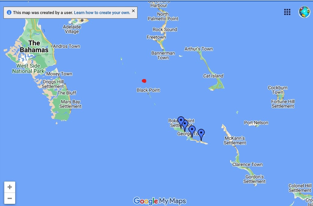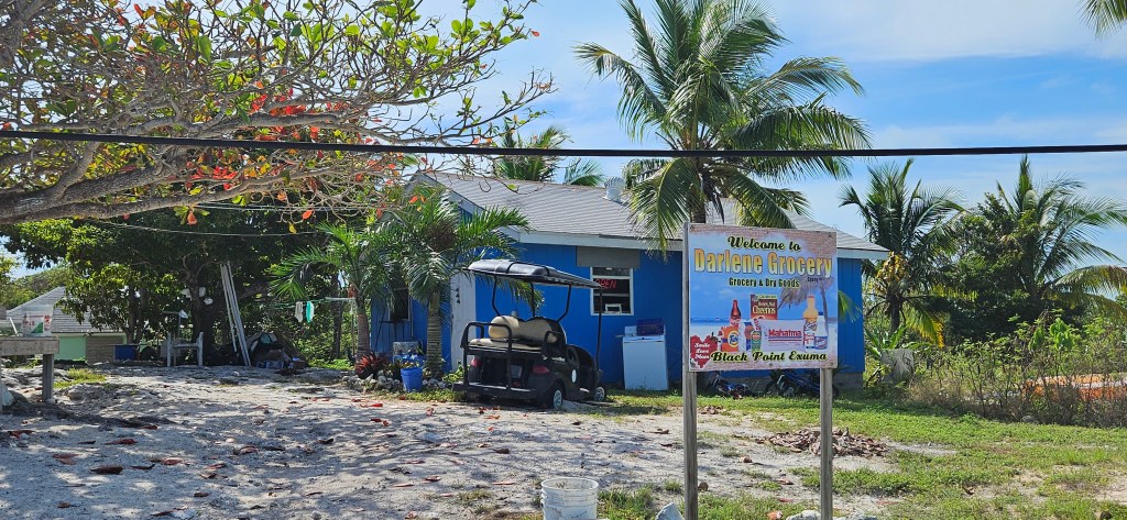 Why were there so many sailboats here, I wondered? George Town, (population 1000), on Great Exuma Island, (indicated by one of the blue dots on the above chart), and approximately 100 miles south of here, attracts up to 600 boats to their annual regattas during the winter months. Generally, keelboats traveling south, use the southbound ICW, not the shallow river route and GICW as we had taken. Some boaters stay in Georgetown the entire winter, while others leave after the regattas and head back north while making stopovers in the islands. Due to its location, and development, Black Point, (population 350), is a popular stopover.