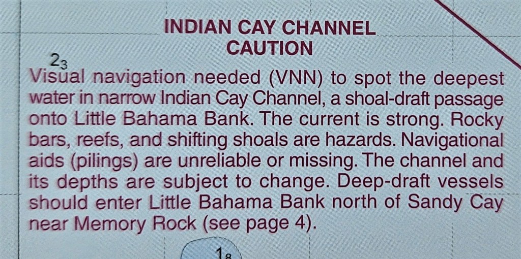 Overall, we experienced a good ride to West End even though several miles were dominated by south winds causing bounce and mild corkscrewing. As we neared Settlement Point at West End, we had a choice to make: take 1- Indian Cay Channel, (shorter route), or 2-the route through Memory Rock, ( not an inspiring name). We chose Memory Rock because we had heard of possible dangers in Indian Cay, and because the note below, was printed on the navigation chart.
