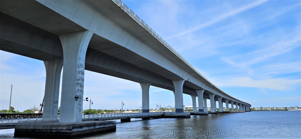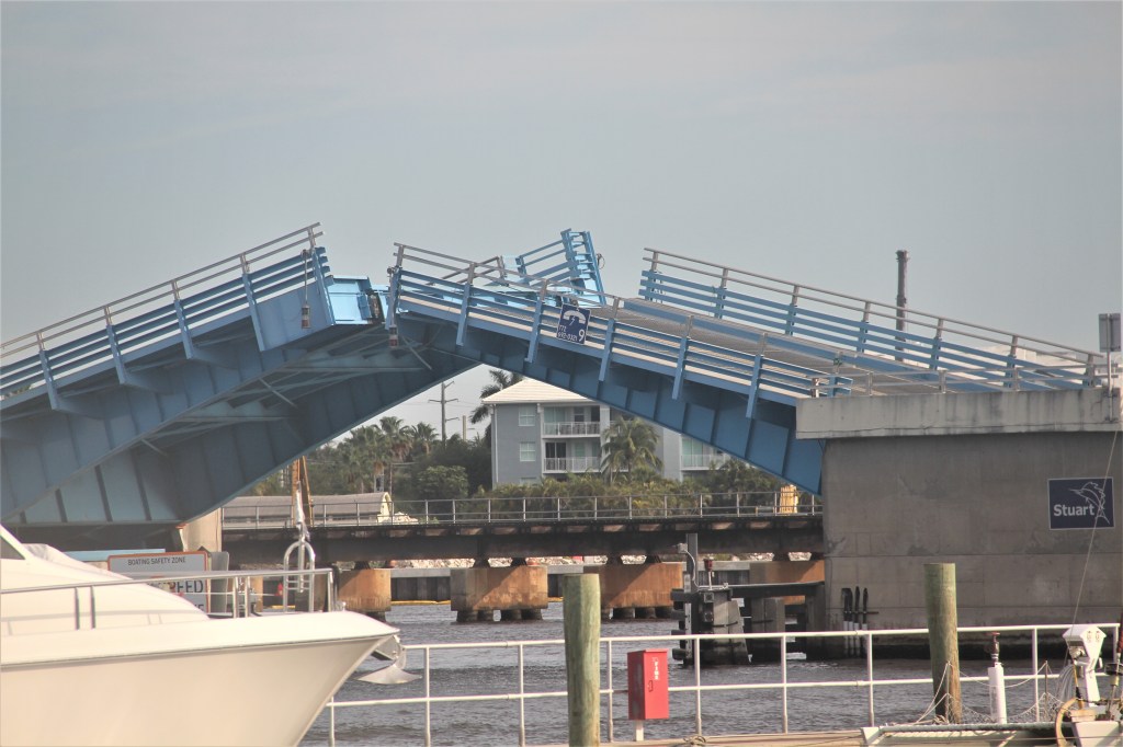 To get to Stuart from the NE, we needed to pass beneath 3 bridges within 800 feet/244 metres of each other. The first bridge is the Roosevelt Bridge. With a clearance of 65 ft., it was designed for most boats to pass underneath it.