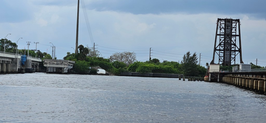 The Florida East Coast Railroad Bridge, with a 7-foot closed vertical is usually open unless a train is coming. Unmanned, the bridge has no schedule but closes 10-15 minutes before a train arrives. It also works in concert with the highway bridge, (above, painted blue). At least that is what official reports say; and it opens on demand, (when there are no trains arriving). If you think this is confusing, you’re right.