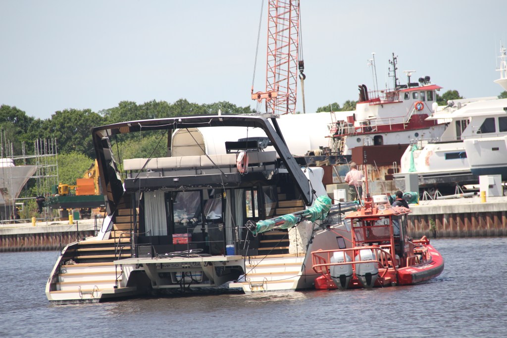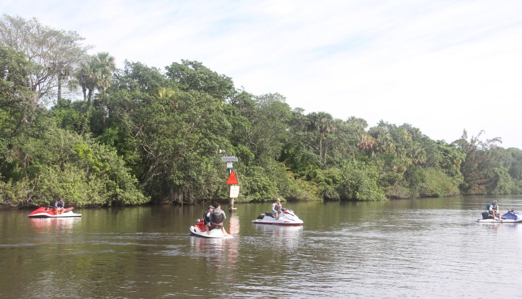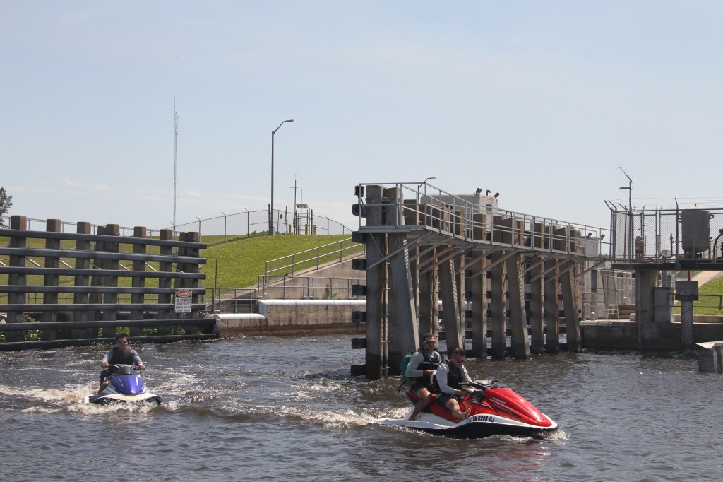 After leaving the lock, the jet skiers overtook us in the canal, racing towards the next lock. But upon approaching Clewiston, (mile 65), where the canal takes a hard 90 degree turn southeast, they missed the turn and instead, drove straight into the Clewiston Lock, just metres from the 90 degree turn.