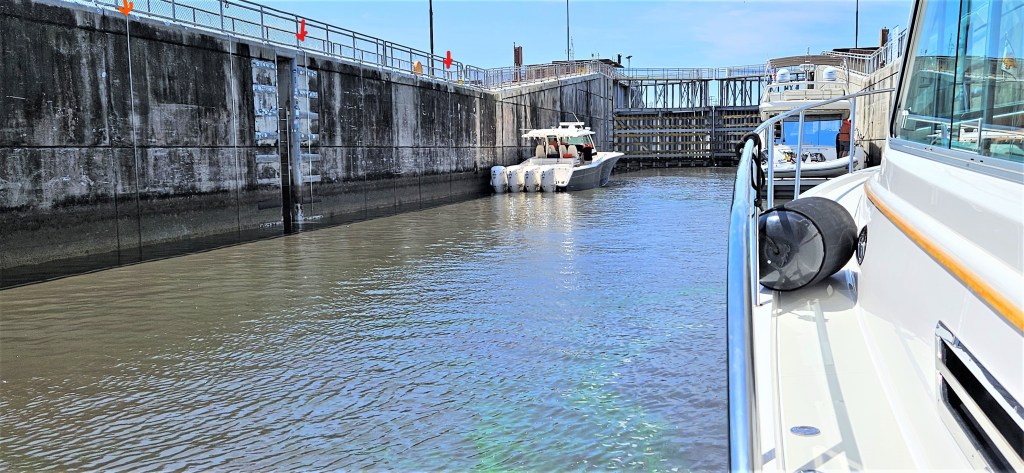 For maximum control, we hooked the lines around cleats playing out the lines while the lock filled. This method offers less control of your boat than in other locks where you can loop a line around a bollard located at deck level.