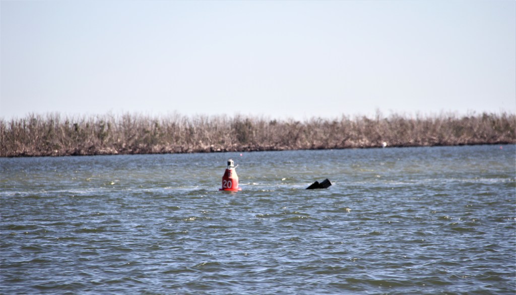 The black buoy above, is an official, but damaged channel marker which has been temporarily replaced with a red buoy.