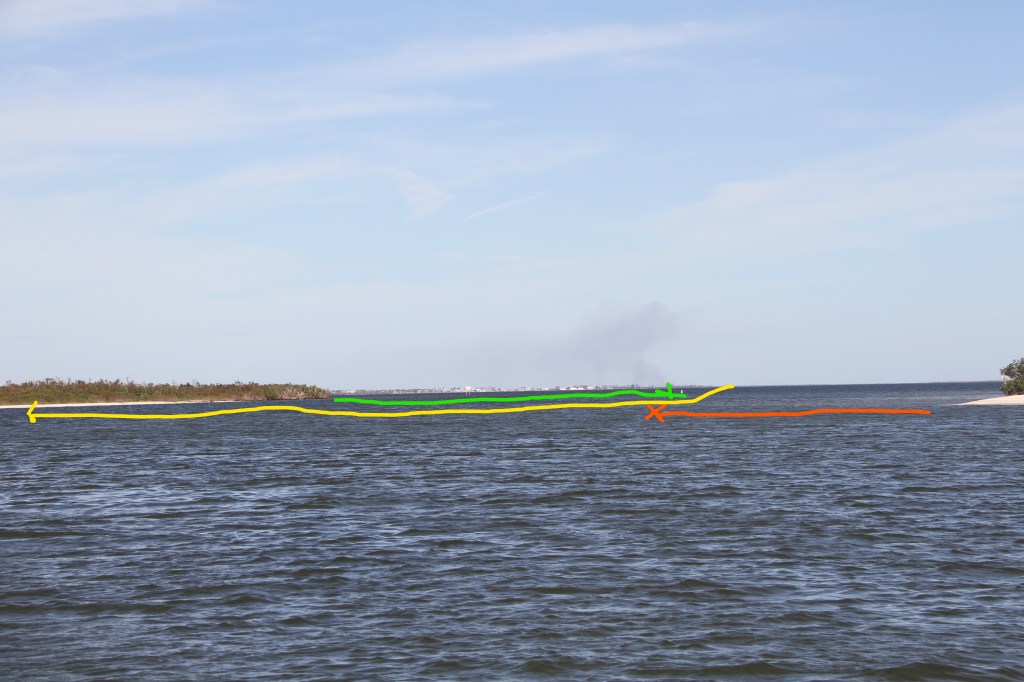 Entering Pelican Bay, boaters need to watch for sand-spits coming off the points, ( green and red lines above.) There are no marker-buoys here but guide books suggest, after entering, to follow the shoreline, and to stay 50 feet (yellow line), off the shore. 50 feet! It is one of those times you have to over-ride your brain warning you not to drive so close to land. (The source of the smoke on the horizon in the background is a burning sugarcane field.)