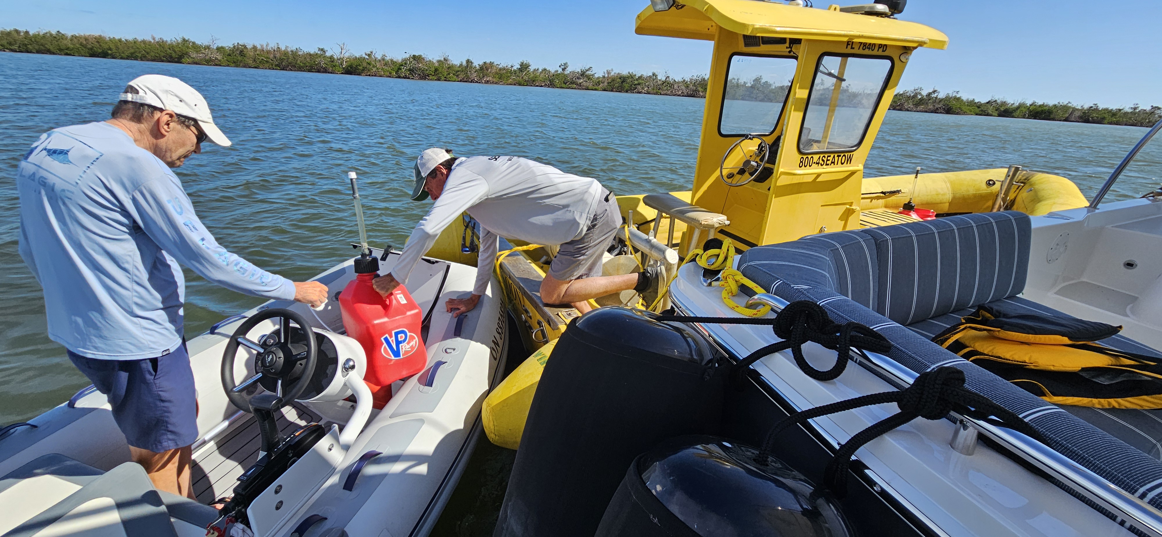 While staying 3 nights in Pelican Bay, we often saw a towboat sitting in the bay waiting to be called by some hapless boater. He told us the towing company was still moving between 25-30 hurricane-damaged boats a week to other locations. We bought fuel from him for our dinghy. The cost was $30. but if we had not been members of Sea Tow, a 24/7 towing service, it would have cost $300!