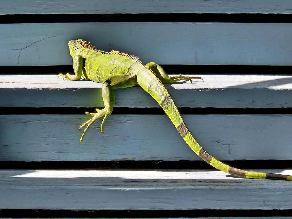 An attractive brilliant green, but with the ability to turn colour to match the surrounding environment, the Green Iguana is an invasive specie that takes its toll on native vegetation, tree snails, insects, seabird and turtle eggs. Their droppings leave deadly bacteria on surfaces that only needs to be touched for a person to become seriously ill. In an attempt to eradicate the specie, exterminators set traps, and the company Hunting Iguanas, offers guided air rifle hunts! In addition, Hunting Iguanas are attempting to develop marketable items such as using the skin for wrapping koozies around glasses, claws for earrings, and back scratchers! Creating recipes to use the meat, is another venture they have undertook; they say the low-fat meat is delicious.
